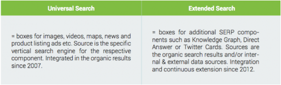 简单来说,通用搜索元素就是谷歌在2007整合到搜索引擎结果页中的元素(如图片、视频、新闻、地图等),而扩展搜索元素则是谷歌为了提高用户搜索体验,而在2012年之后新加入的一些新兴元素(如社交媒体、知识图谱、回答框等)。